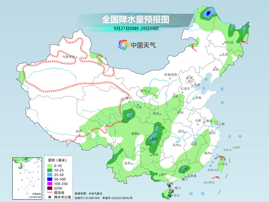 未來三天(9月27日至29日),華西地區(qū)繼續(xù)維持陰雨綿綿的天氣格局,此外在華南、東北等地也將有降水出沒。同時,北方冷空氣活動頻繁,新疆、內(nèi)蒙古以及東北局地降溫可達(dá)8℃以上,江南、華南在副熱帶高壓持續(xù)控制下,最高氣溫普遍超30℃,暑熱猶存。