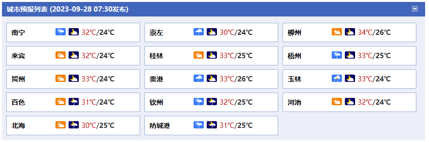 南寧市:今天白天多云有陣雨或雷雨,今天晚上多云、局地有陣雨或雷雨,東北風(fēng)1~2級(jí),最高氣溫32℃,最低氣溫24℃。