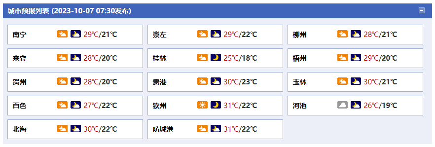 南寧市:今天白天到晚上,多云、局地有陣雨,東北風(fēng)2~3級(jí),最高氣溫29℃,最低氣溫21℃。