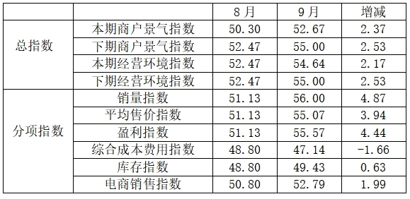 從商戶景氣指數(shù)來看,總指數(shù)中,9月商戶景氣指數(shù)為52.67,比8月的50.30上升2.37個百分點;經(jīng)營環(huán)境指數(shù)為54.64,比8月的52.47上升2.17個百分點。