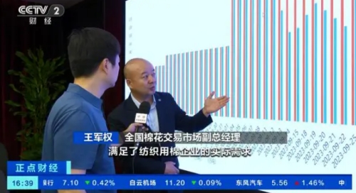 全國棉花交易市場副總經(jīng)理王軍權(quán):每天2萬噸的投放數(shù)量滿足了紡織用棉企業(yè)的實(shí)際需求,從紡織用棉企業(yè)角度講,不擔(dān)心買不到棉花。近兩周成交率71%左右,棉花9月25日的成交價格對比9月1日降幅達(dá)到5%左右。