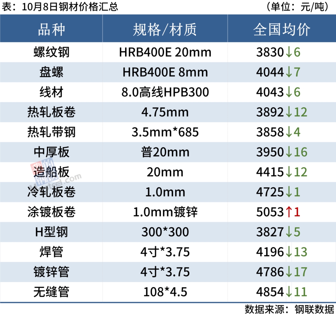 中厚板:10月8日,全國24個主要城市20mm普板均價3950元/噸,較上個交易日下跌16元/噸。雙節(jié)期間中板現(xiàn)貨庫存不斷增量,雖下游采購表現(xiàn)尚可,但貿(mào)易商對后市信心不足,操作方面多積極出貨為主,資源報(bào)價讓價空間較大。鋼廠方面,市場高供給狀態(tài)維持,部分鋼廠接單價格不斷下調(diào),但市場整體訂單積極性不高,需求釋放乏力。綜合來看,商戶對下游需求的可持續(xù)性預(yù)期不高,現(xiàn)貨價格支撐不足,看跌情緒較濃,預(yù)計(jì)9日全國中厚板價格弱穩(wěn)運(yùn)行。