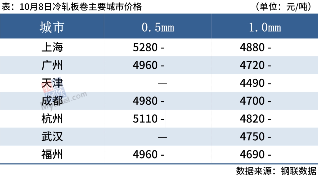 冷軋板卷:10月8日,全國24個主要城市1.0mm冷卷均價4725元/噸,較上個交易日下跌1元/噸。據(jù)市場商家反饋,節(jié)前訂貨資源少量到庫,部分規(guī)格還是暫缺,目前市場上冷軋現(xiàn)貨資源依舊偏緊。心態(tài)方面,大部分商家對于節(jié)后市場持謹(jǐn)慎觀望態(tài)度,操作上以快進(jìn)快出,回籠資金為主。綜合來看,預(yù)計(jì)9日全國冷軋板卷現(xiàn)貨價格或繼續(xù)窄幅震蕩為主。