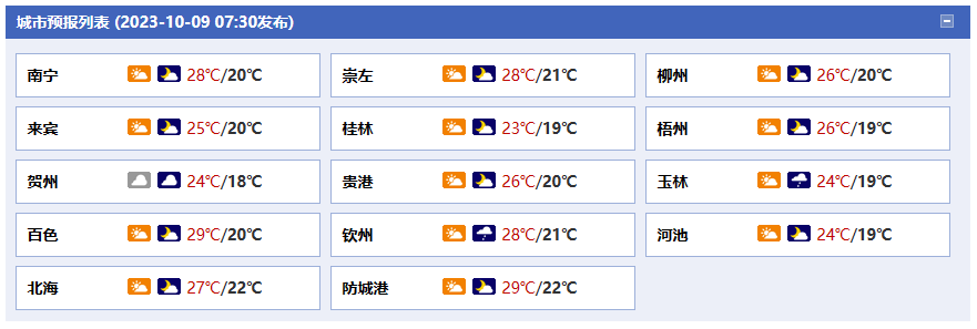 今天白天,全區(qū)多云到晴,其中賀州、梧州、玉林、貴港、北海等市局地有陣雨。