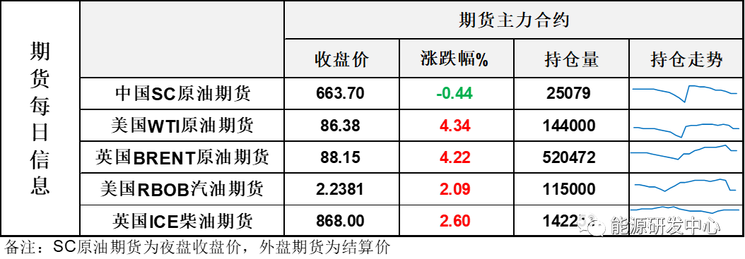 【1】WTI主力原油期貨收漲5.33美元,漲幅4.34%,報(bào)86.38美元/桶;布倫特主力原油期貨收漲3.57美元,漲幅4.22%,報(bào)88.15美元/桶;INE原油期貨收跌0.44%,報(bào)663.7元。