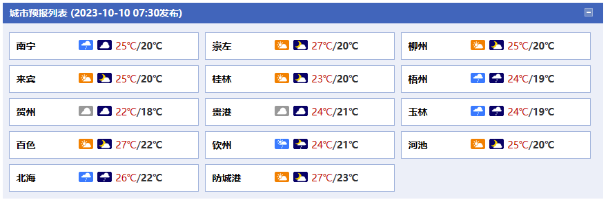 南寧市:今天白天陰天間多云有短時小雨,今天晚上陰天間多云、局地有陣雨,東北風2~3級,最高氣溫25℃,最低氣溫20℃。