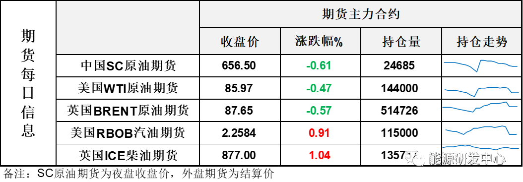 【1】WTI主力原油期貨收跌0.41美元,跌幅0.47%,報(bào)85.97美元/桶;布倫特主力原油期貨收跌0.5美元,跌幅0.57%,報(bào)87.65美元/桶;INE原油期貨收跌0.61%,報(bào)656.5元。