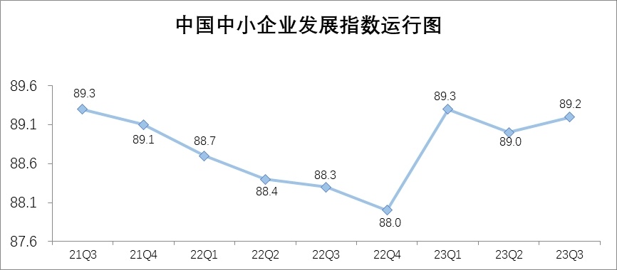 數(shù)據(jù)顯示,中國(guó)中小企業(yè)發(fā)展指數(shù)今年一季度大幅上升1.3點(diǎn),二季度回落了0.3點(diǎn),三季度再次上升0.2點(diǎn),為89.2。