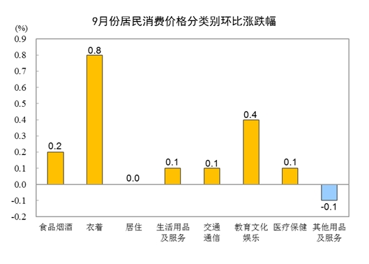 9月份,全國(guó)居民消費(fèi)價(jià)格環(huán)比上漲0.2%。其中,城市上漲0.2%,農(nóng)村上漲0.3%;食品價(jià)格上漲0.3%,非食品價(jià)格上漲0.2%;消費(fèi)品價(jià)格上漲0.4%,服務(wù)價(jià)格下降0.1%。