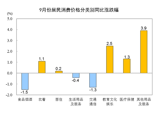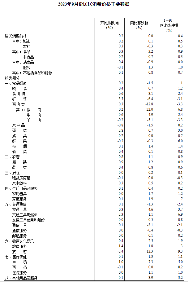 2023年9月份,全國(guó)居民消費(fèi)價(jià)格同比持平。其中,城市上漲0.1%,農(nóng)村下降0.3%;食品價(jià)格下降3.2%,非食品價(jià)格上漲0.7%;消費(fèi)品價(jià)格下降0.9%,服務(wù)價(jià)格上漲1.3%。1—9月平均,全國(guó)居民消費(fèi)價(jià)格比上年同期上漲0.4%。