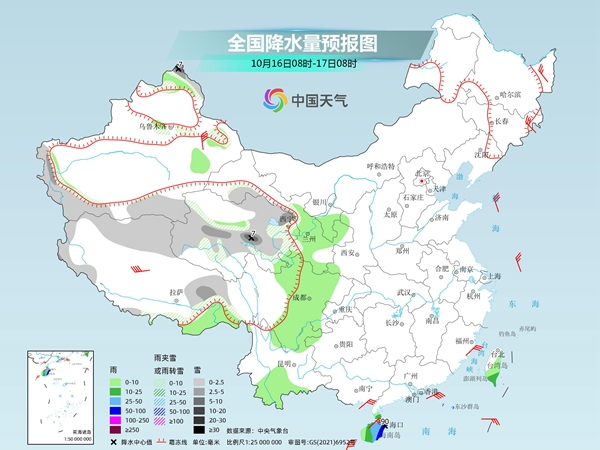 具體來看,中央氣象臺(tái)預(yù)計(jì),今天,新疆北疆北部和南疆南部山區(qū)、西藏北部和東部、青海等地的部分地區(qū)有小到中雪或雨夾雪,其中,新疆北疆北部、青海中部等地局地有大雪;甘肅南部、寧夏、四川西南部和盆地西部、云南東北部和南部、海南島、臺(tái)灣島等地的部分地區(qū)有小到中雨,其中海南島東部有大雨,局地暴雨。