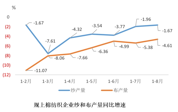 生產(chǎn)穩(wěn)步推進(jìn),紗和布產(chǎn)量降幅繼續(xù)收窄。據(jù)國家統(tǒng)計(jì)局?jǐn)?shù)據(jù),1-8月份,規(guī)模以上棉紡織企業(yè)紗和布產(chǎn)量累計(jì)同比分別下降1.67%和4.61%,降幅較1-7月份分別收窄0.29和0.77個(gè)百分點(diǎn)。