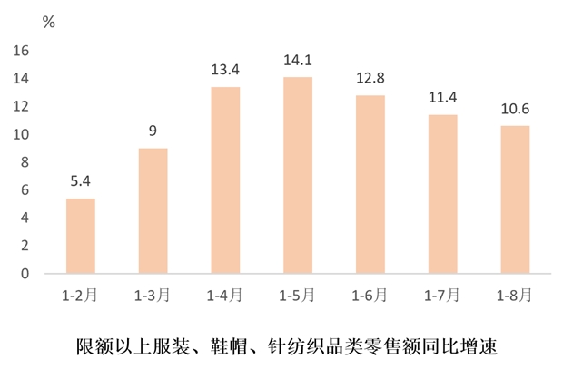 國內(nèi)終端紡織品消費(fèi)持續(xù)恢復(fù)。據(jù)國家統(tǒng)計(jì)局?jǐn)?shù)據(jù),1-8月份,限額以上服裝、鞋帽、針紡織品類零售額同比增長10.6%,增幅較1-7月份下降0.8個(gè)百分點(diǎn),高于社會消費(fèi)品零售總額7.0%的增速。1-8月份,全國網(wǎng)上零售額同比增長12.1%,較1-7月份回落0.4個(gè)百分點(diǎn)。實(shí)物商品網(wǎng)上零售額增長9.5%,其中,穿類商品增長10.9%,增幅較1-7月份收窄1.1個(gè)百分點(diǎn)。