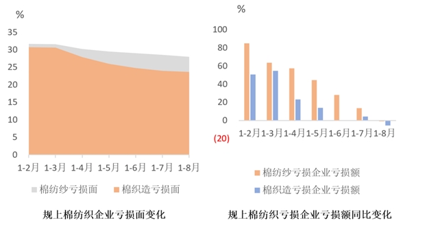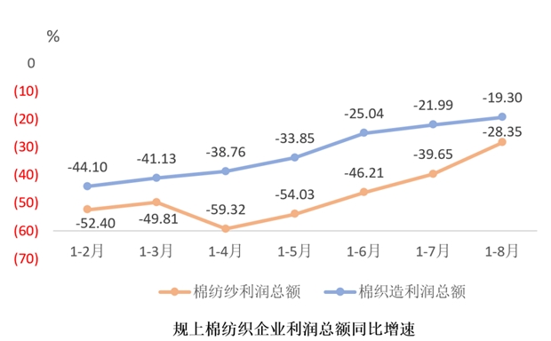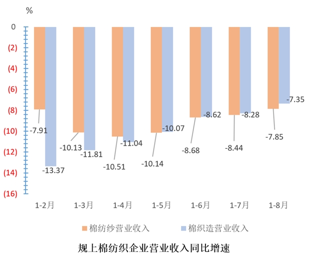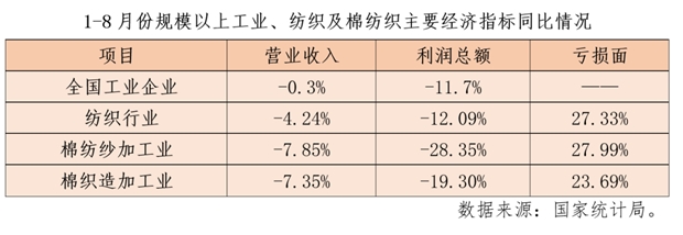 棉紡織行業(yè)主要經(jīng)濟(jì)指標(biāo)降幅收窄,企業(yè)效益逐步改善。據(jù)國家統(tǒng)計(jì)局?jǐn)?shù)據(jù),1-8月份,規(guī)模以上棉紡紗企業(yè)營業(yè)收入同比下降7.85%,降幅較1-7月份收窄0.59個(gè)百分點(diǎn),利潤總額同比下降28.35%,降幅較1-7月份收窄11.3個(gè)百分點(diǎn),虧損面27.99%,較1-7月收窄0.58個(gè)百分點(diǎn);棉織造企業(yè)營業(yè)收入同比下降7.35%,降幅較1-7月份收窄0.93個(gè)百分點(diǎn),利潤總額同比下降19.30%,降幅較1-7月份收窄2.69個(gè)百分點(diǎn),虧損面23.69%,降幅較1-7月份收窄0.3個(gè)百分點(diǎn)。但是,規(guī)模以上棉紡紗和棉織造業(yè)營收和利潤指標(biāo)均顯著弱于全國規(guī)模以上工業(yè)企業(yè)和紡織行業(yè),虧損面仍處于較高水平。