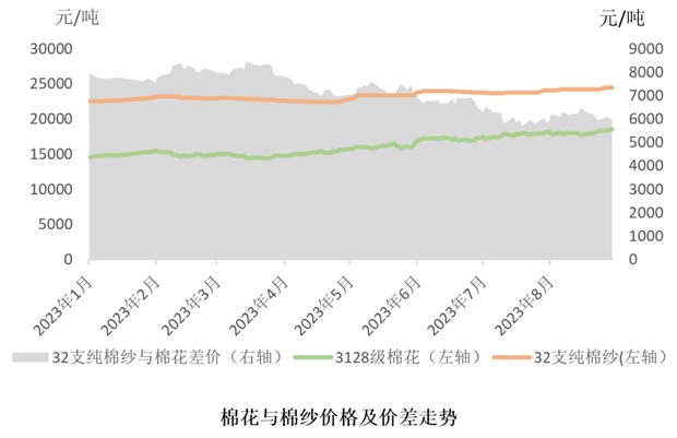 國內(nèi)外棉花價(jià)格依然呈現(xiàn)外弱內(nèi)強(qiáng)格局,國內(nèi)棉花價(jià)格小幅上漲,下游棉紗和棉布價(jià)格提漲困難。8月份,市場購銷整體氣氛偏弱,銷售不暢,成交價(jià)格穩(wěn)中偏弱,中下旬棉布銷售略有改善,但價(jià)格平穩(wěn)。以普梳32支純棉紗與3128B標(biāo)準(zhǔn)級棉花的價(jià)差為代表,8月份花紗價(jià)差縮小至6000元/噸左右,按照即期利潤,企業(yè)仍處于虧損狀態(tài)。