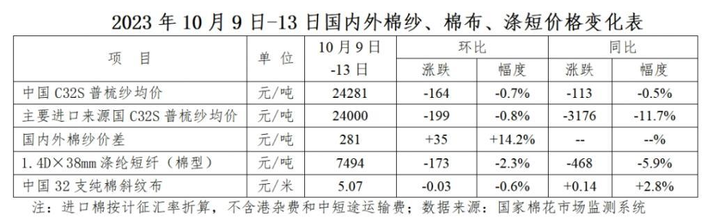 雖然美國農(nóng)業(yè)部下調(diào)了美國棉花2023/24年度產(chǎn)量預(yù)測,但巴以沖突升級加劇美國通脹壓力并引發(fā)市場對世界經(jīng)濟(jì)下行的擔(dān)憂,國際棉花價格承壓下跌。10月9日-13日,紐約棉花期貨主力合約結(jié)算均價85.6美分/磅,較前周下跌1.57美分/磅,跌幅1.8%;代表進(jìn)口棉中國主港到岸均價的國際棉花指數(shù)(M)均價97.36美分/磅,較10月7日下跌0.55美分/磅,跌幅0.6%;折人民幣進(jìn)口成本16949元/噸(按1%關(guān)稅計算,不含港雜和運(yùn)費(fèi)),較10月7日下跌97元/噸,跌幅0.6%。國內(nèi)棉價比國際棉價高1155元/噸,價差較10月7日擴(kuò)大101元/噸。
