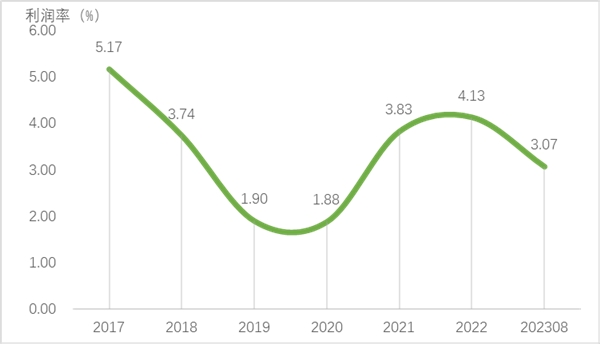 2017-2023年規(guī)模以上毛紡織及染整精加工企業(yè)平均利潤率變化情況