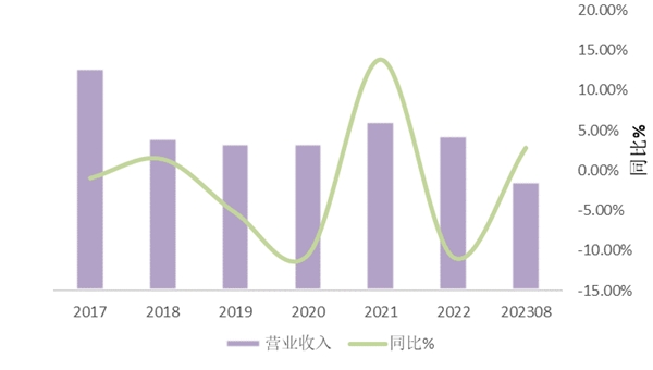 2017-2023規(guī)模以上毛紡織及染整精加工企業(yè)營業(yè)收入與同比變化情況