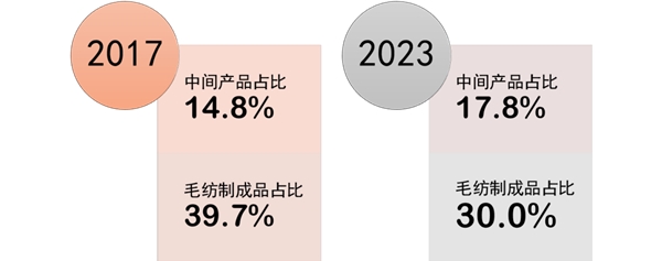 2017年與2023年毛紡原料與制品品類出口占比變化