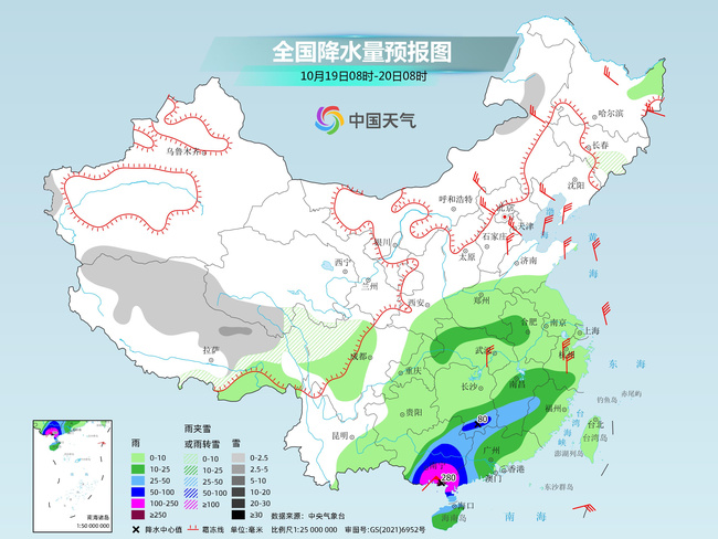 受臺(tái)風(fēng)和冷空氣共同影響,未來(lái)三天(10月19日至21日),華南部分地區(qū)強(qiáng)降雨連連,廣東、廣西等局地有特大暴雨,需防范連續(xù)強(qiáng)降雨可能引發(fā)的次生災(zāi)害。氣溫方面,隨著冷空氣繼續(xù)東移南下,中東部氣溫將大面積刷新立秋后的新低,南方冷暖轉(zhuǎn)換明顯,公眾請(qǐng)及時(shí)調(diào)整著裝,謹(jǐn)防感冒。