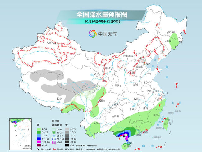 明天,新疆南疆盆地、西藏北部和東部、青海南部和西部、浙江中部、江南南部、川西高原北部、云南西南部、華南、臺(tái)灣島等地部分地區(qū)有小雪。華南南部等地部分地區(qū)有大到暴雨,其中,廣西東南部沿海、廣東西南部等地部分地區(qū)有大暴雨,廣西東南部沿海等地局地特大暴雨。