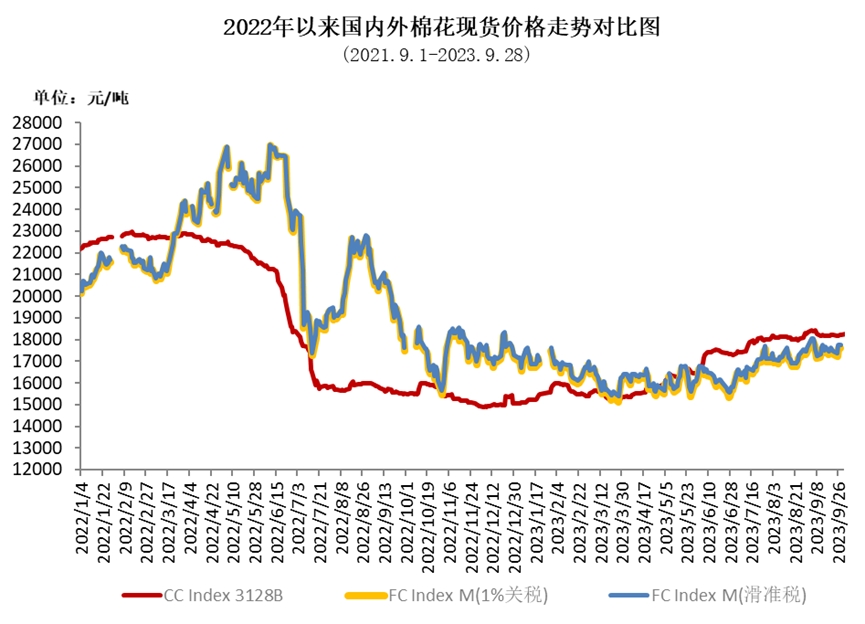 月初,受美棉減產(chǎn)預(yù)期影響,ICE棉花期貨主力合約一度接近90美分/磅,之后市場對美國通脹的擔憂加劇,美聯(lián)儲加息預(yù)期增強,商品市場承壓,棉價有所回落。9月,ICE期棉主力合約月均結(jié)算價在87.42美分/磅,環(huán)比上漲1.77美分,漲幅2%。中國進口棉價格指數(shù)FCIndex M月均為98.99美分/磅,環(huán)比上漲1.65美分;月底為99.72美分/磅,環(huán)比上漲0.06美分,1%關(guān)稅下折人民幣17623元/噸,低于同期中國棉花價格指數(shù)(CCIndex3128B)597元。