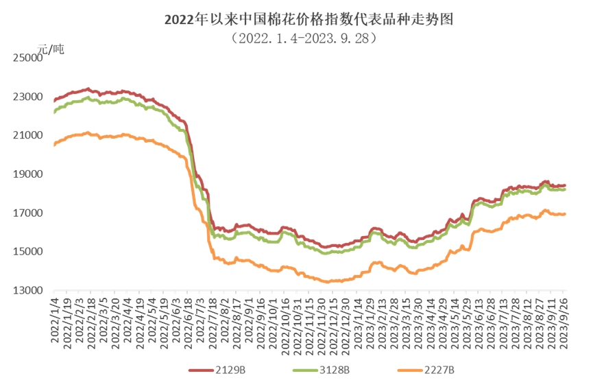 9月,國內(nèi)棉花現(xiàn)貨市場供應(yīng)較為充裕,儲備棉競拍成交率依然較高,滑準稅配額逐漸下發(fā)至紡織企業(yè),國內(nèi)棉價月初上漲至年內(nèi)新高,之后小幅回調(diào)趨于穩(wěn)定。月中下旬因紡織旺季不及預(yù)期,國內(nèi)棉紗成品庫存增加且銷售價格下行,紡織企業(yè)對原料采購力度有所轉(zhuǎn)弱,國儲棉及現(xiàn)貨市場成交略有下降。國際市場,受美棉減產(chǎn)和美聯(lián)儲加息預(yù)期增強等因素影響,國際棉價震蕩上漲。