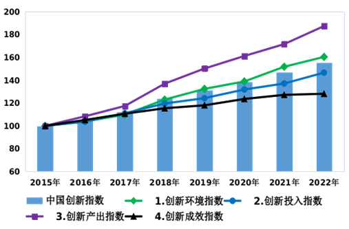 圖 2015—2022年中國創(chuàng)新指數(shù)及分領(lǐng)域指數(shù)(2015年=100)