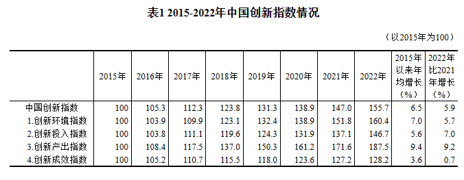 測算結(jié)果顯示,以2015年為基期,2022年中國創(chuàng)新指數(shù)為155.7,4個分領(lǐng)域指數(shù)創(chuàng)新環(huán)境指數(shù)、創(chuàng)新投入指數(shù)、創(chuàng)新產(chǎn)出指數(shù)和創(chuàng)新成效指數(shù)分別為160.4、146.7、187.5和128.2。與2015年相比,中國創(chuàng)新指數(shù)年均增長6.5%,比同期國內(nèi)生產(chǎn)總值(GDP)增速快0.8個百分點;4個分領(lǐng)域指數(shù)年均增速分別為7.0%、5.6%、9.4%和3.6%。與2021年相比,中國創(chuàng)新指數(shù)增長5.9%,4個分領(lǐng)域指數(shù)分別增長5.7%、7.0%、9.2%和0.7%(詳見表1)。