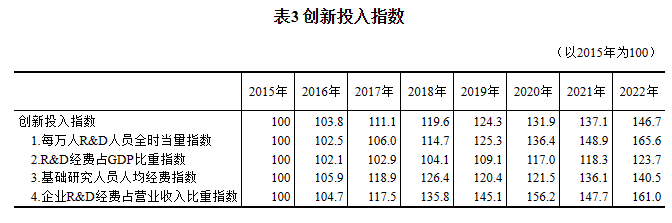 以2015年為100,2022年我國創(chuàng)新投入指數(shù)為146.7,年均增長5.6%。分指標看,每萬人R&D人員全時當量指數(shù)增長相對較快,年均增速為7.5%,2022年指數(shù)值為165.6;企業(yè)R&D經(jīng)費占營業(yè)收入比重指數(shù)、基礎(chǔ)研究人員人均經(jīng)費指數(shù)、R&D經(jīng)費占GDP比重指數(shù)的年均增速分別為7.0%、5.0%和3.1%,2022年指數(shù)值相應(yīng)為161.0、140.5和123.7(詳見表3)。