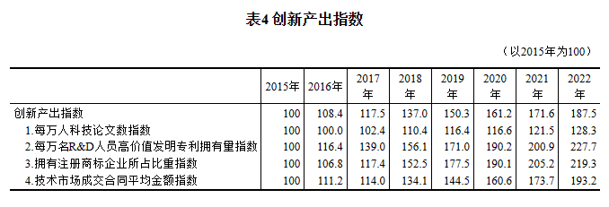 以2015年為100,2022年我國創(chuàng)新產(chǎn)出指數(shù)為187.5,年均增長9.4%。分指標看,每萬名R&D人員高價值發(fā)明專利擁有量指數(shù)、擁有注冊商標企業(yè)所占比重指數(shù)實現(xiàn)大幅提升,年均增速分別達12.5%和11.9%,2022年指數(shù)值分別為227.7和219.3,在全部18個指標中位列第二和第三;技術(shù)市場成交合同平均金額指數(shù)增長也較快,年均增速為9.9%,2022年指數(shù)值為193.2;每萬人科技論文數(shù)指數(shù)年均增速為3.6%,2022年指數(shù)值為128.3(詳見表4)。