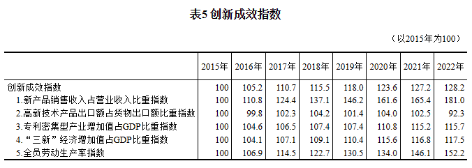 “創(chuàng)新成效”領(lǐng)域包括新產(chǎn)品銷售收入占營業(yè)收入比重、高新技術(shù)產(chǎn)品出口額占貨物出口額比重、專利密集型產(chǎn)業(yè)增加值占GDP比重、“三新”經(jīng)濟增加值占GDP比重、全員勞動生產(chǎn)率等5個指標。