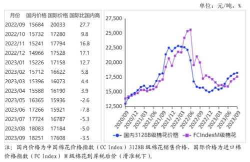 (三)內(nèi)外棉價(jià)差縮小。Cotlook A指數(shù)(相當(dāng)于國(guó)內(nèi)3128B級(jí)棉花)折合人民幣每噸15525元,比中國(guó)棉花價(jià)格指數(shù)(CC Index)3128B級(jí)每噸低2726元,價(jià)差比上月縮小273元。進(jìn)口棉價(jià)格指數(shù)(FC Index)M級(jí)(相當(dāng)于國(guó)內(nèi)3128B級(jí)棉花)月均價(jià)每磅98.87美分,1%關(guān)稅下折到岸稅后價(jià)每噸17474元,比國(guó)內(nèi)價(jià)格低777元,價(jià)差比上月縮小260元;滑準(zhǔn)稅下折到岸稅后價(jià)每噸17608元,比國(guó)內(nèi)價(jià)格低643元,價(jià)差比上月縮小256元。