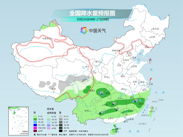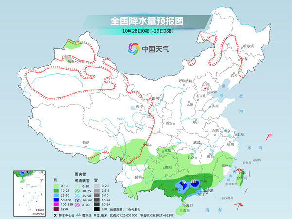 明天開始,降雨的重心將逐漸向華南轉(zhuǎn)移。預(yù)計新疆北疆北部、西藏東部等地部分地區(qū)有小到中雪或雨夾雪,局地大雪。西南地區(qū)大部、江南大部、華南等地有小到中雨,局地大雨。