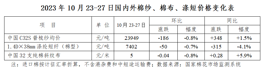 本周(2023年10月23-27日),國內(nèi)外棉價(jià)有所反彈,均價(jià)低于前周;國內(nèi)棉紗價(jià)格繼續(xù)回落;滌綸短纖價(jià)格持續(xù)走低。