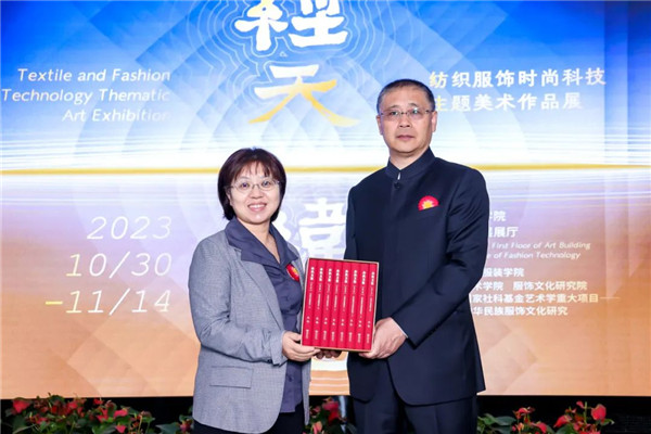 本次展覽策展文案以《孫機文集》中的紡織服飾研究內容為線索,這本文集集結了中國國家博物館終身研究館員、北京服裝學院特聘教授孫機先生的研究成果。開幕式上,商務印書館編審李靜向北京服裝學院美術學院、服飾文化研究院贈送《孫機文集》,美術學院院長關立新接受贈書并發(fā)言。