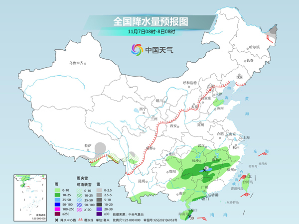 昨天,受今冬首輪寒潮影響,內(nèi)蒙古東部和東北部分地區(qū)出現(xiàn)強(qiáng)降雪。監(jiān)測顯示,內(nèi)蒙古東南部、遼寧中西部降水量10~25毫米、局地超過30毫米,部分地區(qū)最大積雪深度1~8厘米,局地超過14厘米。與此同時,冷空氣南下過程中還給南方帶來強(qiáng)對流天氣,廣西北部、海南島東北部、湖南南部、江西北部、浙江西北部等地部分地區(qū)出現(xiàn)大雨或暴雨,廣西河池局地大暴雨。