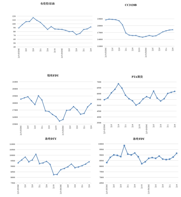 圖1 2022年1月~2023年9月我國化纖長絲、棉花、PTA期貨及布倫特原油價格走勢