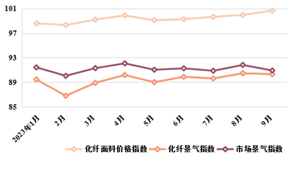 圖2 2023年1~9月我國市場景氣、化纖景氣和化纖面料價格指數(shù)走勢