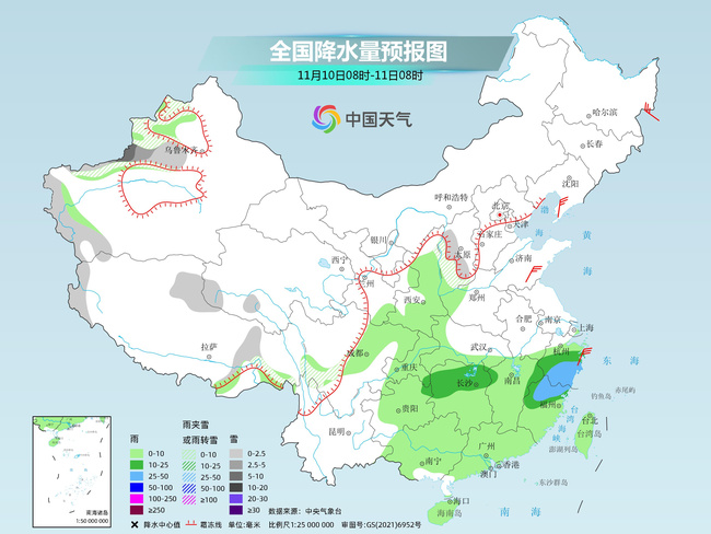 后天,新疆沿天山地區(qū)和南疆西部山區(qū)、山西中部等地部分地區(qū)有小到中雪或雨夾雪,局地大雪。西北地區(qū)東南部、江漢西部、江南、西南地區(qū)東部、華南、臺(tái)灣島等地部分地區(qū)有小到中雨,其中,浙江中南部、福建北部等地部分地區(qū)有大雨。