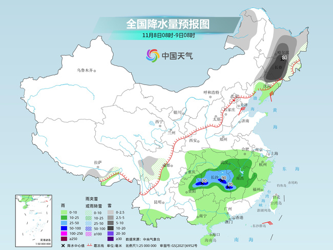 今天(11月8日),東北降雪又將發(fā)展,黑龍江、吉林等地部分地區(qū)有大到暴雪,東北前期降雪明顯,需注意防范連續(xù)降雪的疊加影響。明天東北降雪減少,新疆雨雪發(fā)展。此外,南方的江南等地今明天多降雨天氣,部分地區(qū)有大到暴雨。氣溫方面,未來幾天,影響我國(guó)的冷空氣仍然頻繁,本周末前后中東部氣溫將大面積創(chuàng)今年下半年來新低。