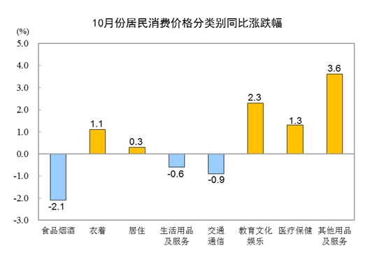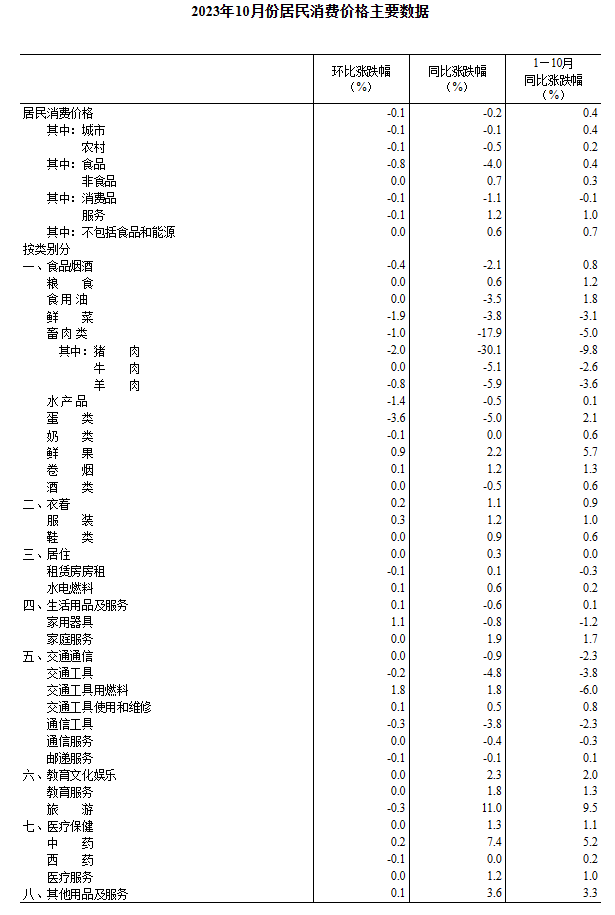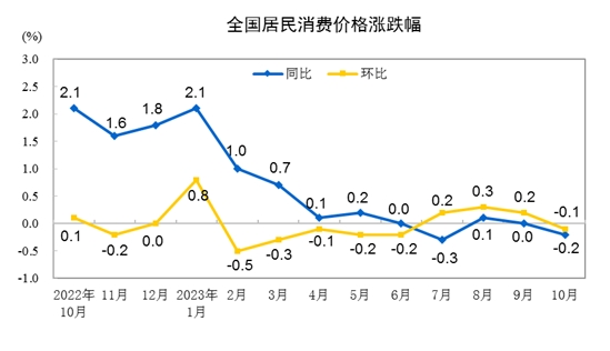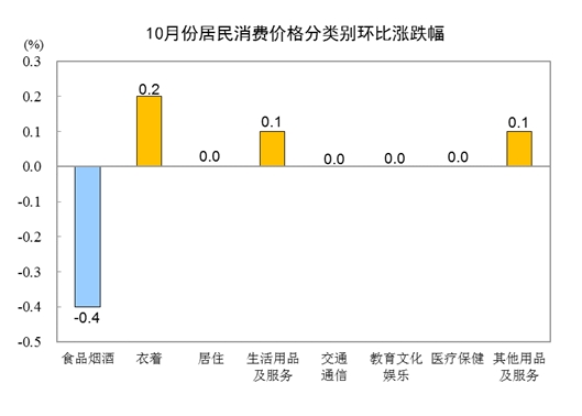 10月份,全國居民消費價格環(huán)比下降0.1%。其中,城市下降0.1%,農(nóng)村下降0.1%;食品價格下降0.8%,非食品價格持平;消費品價格下降0.1%,服務價格下降0.1%。