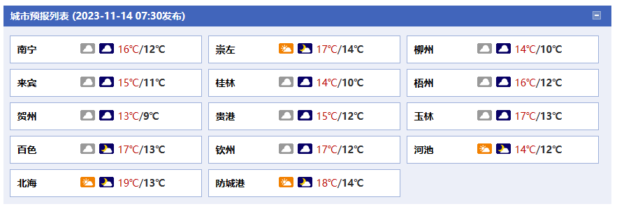 南寧市:今天白天到晚上,陰天、局地有小雨,東北風(fēng)2~3級(jí),最高氣溫16℃,最低氣溫12℃。
