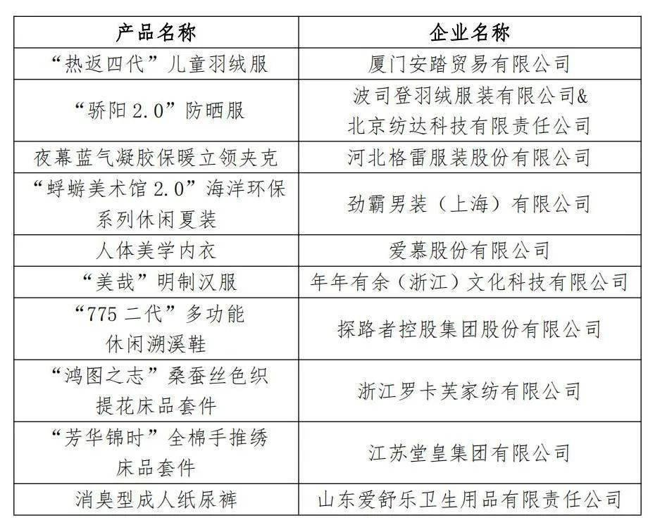 為貫徹落實《國務院辦公廳關(guān)于開展消費品工業(yè)“三品”專項行動營造良好市場環(huán)境的若干意見》(國辦發(fā)〔2016〕40號)及工業(yè)和信息化部消費品工業(yè)司積極開展數(shù)字“三品”行動的精神,倡導以市場需求為導向的技術(shù)創(chuàng)新與設計創(chuàng)意,發(fā)揮創(chuàng)新產(chǎn)品的示范引領(lǐng)作用,提高創(chuàng)新產(chǎn)品的品質(zhì)滿意度和品牌信任度;深入實施數(shù)字化賦能“三品”戰(zhàn)略,促進消費品工業(yè)高質(zhì)量發(fā)展;受工業(yè)和信息化部消費品工業(yè)司委托,中國紡織工業(yè)聯(lián)合會開展了2023年度十大類紡織創(chuàng)新產(chǎn)品培育和推廣工作。中國紡織工業(yè)聯(lián)合會對申報企業(yè)及產(chǎn)品進行了資格和形式審查、消費者投票和專家評定,決定: