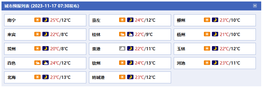 南寧市:今天,晴間多云,東北風(fēng)3~4級、陣風(fēng)6~7級,最低溫度13℃,最高溫度24℃。
