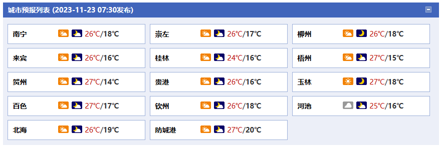24日白天到25日晚上,桂西北多云到陰天、局地有小雨,我區(qū)其它地區(qū)晴間多云。