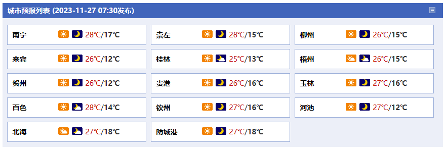 南寧市:今天白天到晚上,晴間多云,東北風1~2級,最高氣溫28℃,最低氣溫17℃。