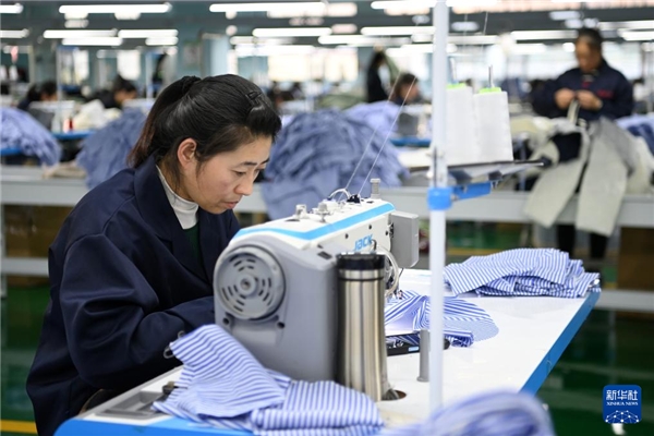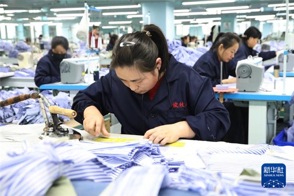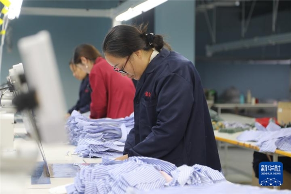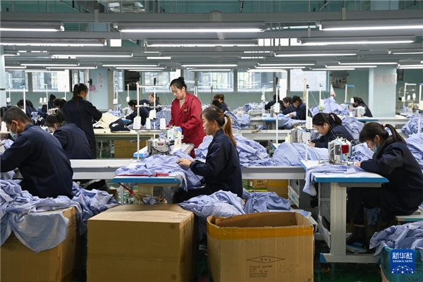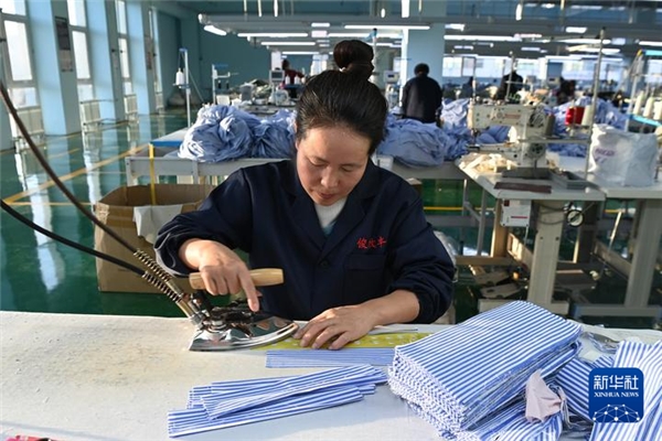 11月23日,工作人員在膠州·通渭服裝產(chǎn)業(yè)園的一家服裝企業(yè)生產(chǎn)車間工作。新華社記者 范培珅 攝