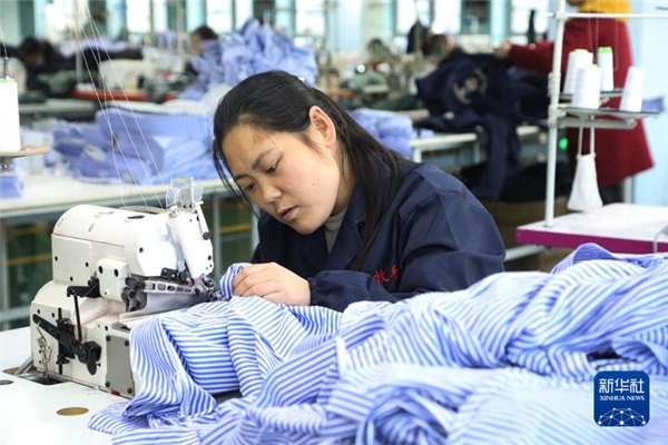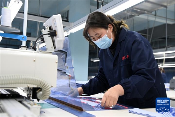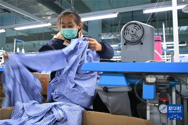 11月23日,工作人員在膠州·通渭服裝產(chǎn)業(yè)園的一家服裝企業(yè)生產(chǎn)車間工作。 新華社記者 范培珅 攝