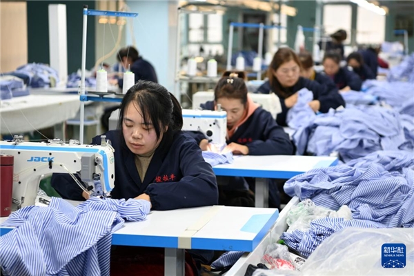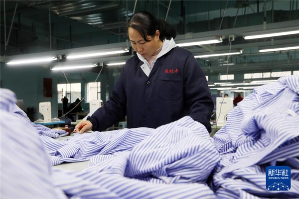 11月23日,工作人員在膠州·通渭服裝產(chǎn)業(yè)園的一家服裝企業(yè)生產(chǎn)車間工作。新華社記者 馬莎 攝